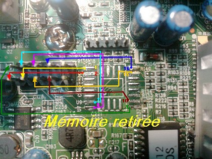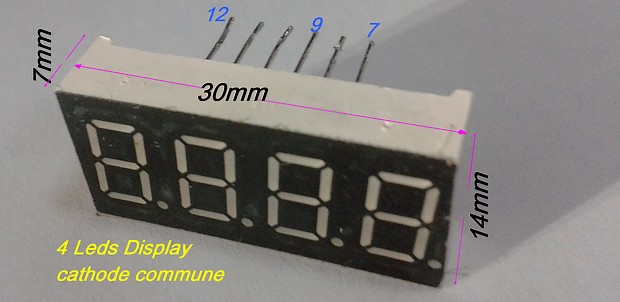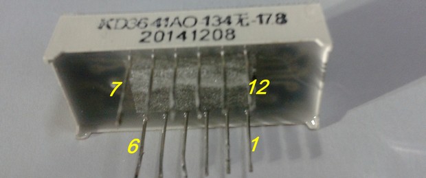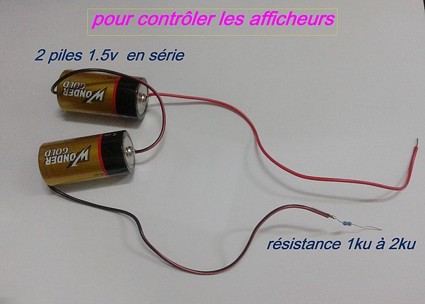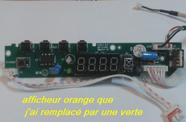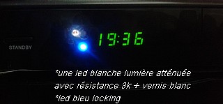 j'ai coupé la patte + de la led double (rouge/orange) et raccordé ma led blanche (+) ;le - est soudé avec une résistance de 3.9k à la masse ...,mon afficheur vert a été récupéré sur un azbox hs (même shéma de banchement) seulement tous ses pins étaient en position horizontale, j'ai du de ce fait raccorder des fils de branchement vers la carte=====>c'est pas plus beau ?