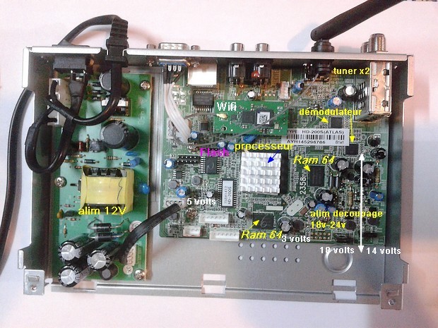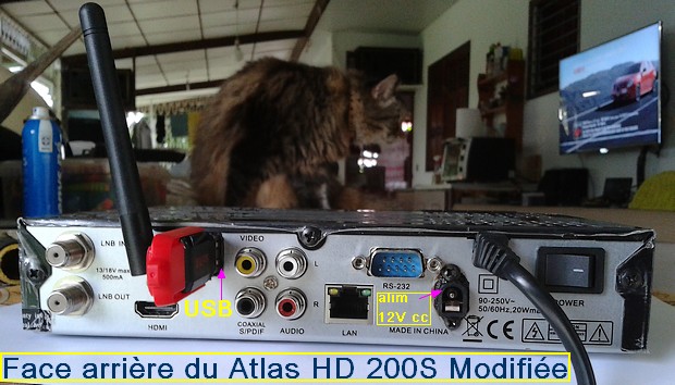 Atlas-HD200SK.Y.N.G OS (non linux) Algérie(année 2014)Video by Richard Rochemont - French GuianaUn Récepteur très rapideSuccesseur du HD 100 avec 128mo de ram. Livré avec une notice simple ,un câble HDMi ,une télécommande ultra mince (genre Engel 4800)!! pas de pile !!! - Processeur Fujitsu MB86H61. Un décodeur multi-standard Full HD (1920 pixels x 1080 lignes) LSI capable de décoder les deux types de compression vidéo MPEG-2 et H.264. - 64 Mo de mémoire flash. - 128 Mo de RAM. 2xDDR DRAM NT5TU64M16GG-AC - Tuner DVB-S2 . - Port Ethernet RJ45. - Port USB 2.0 en face avant - Capacité de stockage de 6000 chaînes numériques. Ports ethernet, USB 2.0 et RS-232 Antenne Wi-Fi Dongle Interne (avec le patch) 1 lecteur de carte pour l'accès conditionnel Video CVBS Audio RCA L/R Sortie audio numérique S/PDIF HDMI DiSEqC 1.0, 1.1, 1.2 y USALS Fonction de contrôle parental EPG (Guide électronique des programmes) Vidéo MPEG-2, MPEG-4, MPEG-4 AVC/H.264 Format image 4:3, 16:9 Résolution image 480i, 480p, 576i, 576p, 720p, 1080i, 1080p Audio numérique MPEG1 Audio Layer 1, 2 & 3 (MP3) Alimentation AC 180 ~ 240 V, 50/60 Hz Dimensions 54 x 215 x 155 mm Poids net 1,2 kg Le boitier est légèrement plus grand que la série Azbox Wifi ou twin la télécommande est identique à l'Engel ,mais avec des codes de sélection différents Il faut mettre le patch prévu pour la zone AmSud pour le contrôle d'accés pour décrypter les chaines et pour avoir le 2° tuner