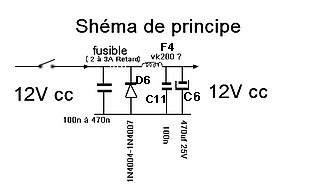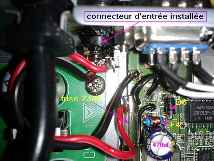 Sur certaine carte du HD 200 il existe aussi l'emplacement pour une entrée extérieure en optionLa self peut être une Vk200 pour filtrer les fréquences HF ou une petite self de flitrage d'alimentatoin laissant passer au moins 2A peut être installée si vous n'avez tout cela ,la self sera faite "au pif "avec du fils de cuivre isolé (0,1mm par exemple) 20 à 30 tours sur une résistance d'1Mohm 1/4w (bricolage) (la D6 protège contre une inversion d'alimentation et aussi le retour de tension inverse de la self ). pour le fusible vous prennez le fil d'un fusible normale et soudez sur le circuit ,un fusible temporisé est conseillé prace qu'il se produit un choc d'alimentation en branchant l'alimentation extérieure pour pouvez utiliser l'interrupteur du 220v comme inter (en enlevant le cable du 220v bien sure!!) puisse que votre alim à découpage est HS!!