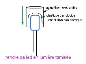 Rendre ses leds en lumière tamiséej'avais que des leds 3mm de haute luminosité ,blanche et bleu alors j'ai réalisé le simple montage suivant : couper un petit bout de plastique translucide d'un sac plastique (essayer de récuperer un qui n'est pas biodégradable) puis un bout de gaine thermorétrable si possible que l'on enfonce avec le bout de plastique autour de la lampe ,on chauffe une peu la gaine et c'est terminé