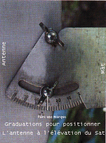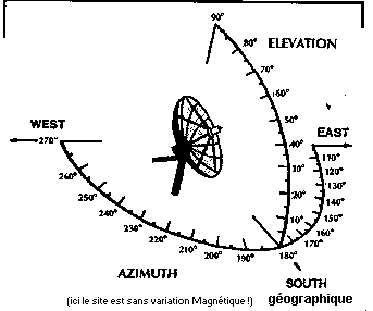 Un peu de technique,un tout petit peu! 1 °) Pour trouver la position d'un satellite : il faut savoir sa longitude Expl : Astra est situe à 19°,2 Est de longitude (le 0° est la position de Greenwhich) 2° ) Connaitre le lieu où l'on se trouve (Mais oui bien sûr !! ) Paris est à 48°5' Nord de latitude(bleu) et de 2°,20' Est de Longitude (mauve) Matoury est à 4°,51' Nord de latitude et de 52°,3' West de longitude 3° ) Convertir ces degrés en degré décimale ( Eh oui !) Bien entendu nous allons pas faire de calcul : il existe des Bases de donnée un peu partout sur le Net . Ou sinon télécharge la base de données crée par rri ou la base simplifiée sous excel.Attention si tu n'es pas un matheux , envoies tes coordonnées &Selon le lieu où l'on se situe, Le même satellite ne se trouve pas avec les même angles d'élévation et d'azimut qu'un autre site En conclusion si tu habites Paris par exp: 48,83N Lat. et 2,33E Long. la variation magnétique est de 4,2 °W (vert sur le schéma) Si tu as une boussole, elle indiquera le champ magnétique (Nord/sud Magnétique) Pour info :Le nord Magnétique se trouve vers les environs de baie de Hudson au Canada Et le Nord Géographique se trouve dans l'ocean Arctique C'est compliqué?Ton vrai sud sera à 180° + 4,2°(variation ouest) = 184°,2 Si tu regardes une mappemonde , les lignes qui concourrent vers l'océan arctique ceux sont les lignes de longitude Et les satellites de Tv sont positionnés tout autour à la latitude zéro (Equateur) et à 36000km de la terre (position géostationnaire ) à cette position les satellites "semblent fixes". Bref! Tout cela pour dire que si tu as une antenne mobile ,elle sera dirigée vers Ton SUD GEOGRAPHIQUE.Pour notre cas Ici,antenne fixe ,deux angles seront nécessaires au pointage de l'antenne Le satellite Astra (19,2° E) Pour Paris : L'élévation est de 31°65 et l'azimut de 158°06 +4°,2 =162°,26 L'angle d'azimut c'est l'angle de rotation Est /Ouest qui faut faire pour se positionner vers la longitude du satellite L'angle d'élévation ,est l'angle qu'il faire pour viser le satellite du sol vers celui çi Bien ,passons à la suite Le mât est perpendiculaire :90° des deux côtés !!! si tu veux moins souffrir lors de la recherche !
